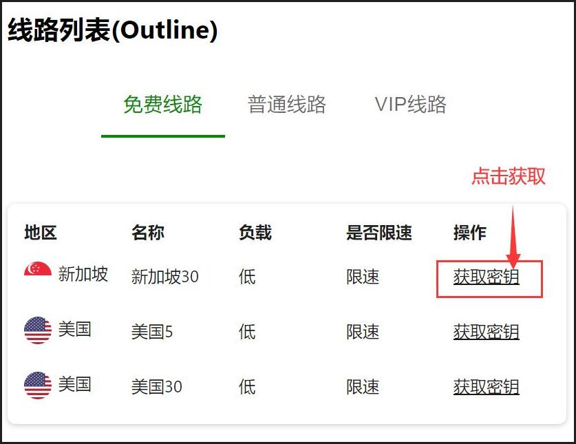 - 登录成功后,在线路列表中的某个地区线路后点击:获取密钥 按钮,即可完成复制.